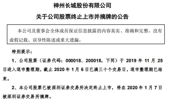 2020年1月6日晚间,神城A退发布公告,公司股票(证券代码:000018、200018)于2019年11月25日进入退市整理期,截至2020年1月6日已满三十个交易日,退市整理期已结束。公司股票已被深交所决定终止上市,将在2020年1月7日被深交所摘牌。