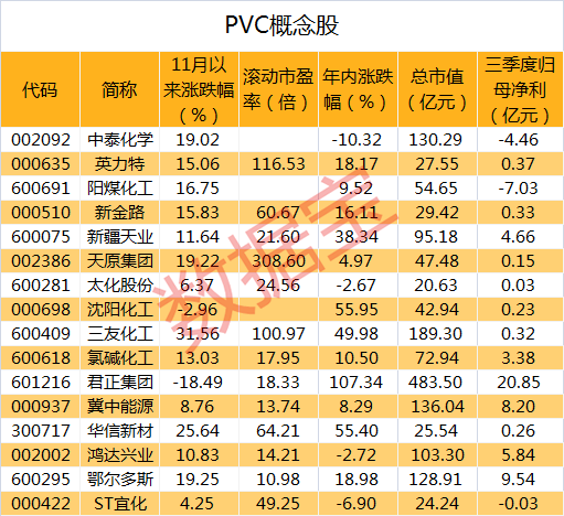 受益于价格的上涨,今年部分上市公司的PVC业务已在第三季度增长明显。四季度已经过半,如果PVC价格保持高位,以PVC为主营收入的上市公司无疑将迎来业绩爆发。