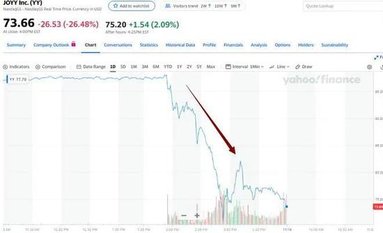 Block表态后,欢聚时代股价瞬间跳水,不到十分钟时间,日内跌幅从2.5%左右迅速扩大到10%以上,此后跌幅进一步扩大,跌幅一度超过30%,最终收跌26.48%。