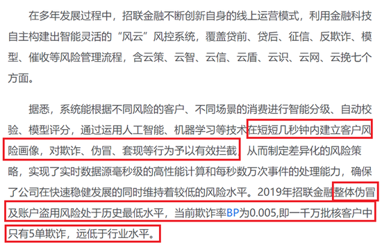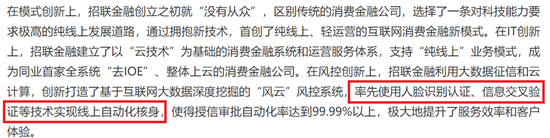 从招联金融对外宣传看,其有能力进行人脸识别,防止欺诈和伪冒等行为。例如,在某个新闻稿中,招联金融称,该公司“率先使用人脸识别认证、信息交叉验证等技术实现线上自动化核身”;在另一则宣传中,招联金融表示,其运用人工智能和机器学习技术能在“短短几秒钟内建立客户风险画像,对欺诈、伪冒、套现等行为予以有效拦截”;其当前欺诈率BP为0.005,即一千万批核客户中只有5单欺诈。
