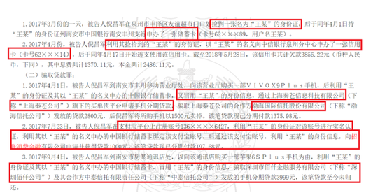 1、2017年4月1日,倪某到南安市丰州移动营业厅处(注意此处为线下场景),以向该营业厅购买一部VIVOX9Plus手机为由,利用“王某”的身份证及以“王某”的名义申办的中国银行储蓄卡,通过上海秦苍公司旗下的买单侠平台,以“王某”的名义向渤海信托公司申请贷款2800元。签订合同后渤海信托公司发放贷款2800元并转入“王某”名下尾号为0289的中国银行储蓄卡账户内,被告人倪某利用该款项购买手机。