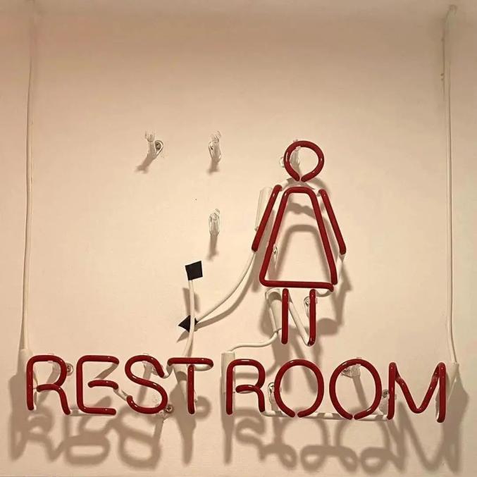 这块标志上,店家将一个男性“小人”做成扒在挡板上方的样子,而在挡板下方,则是一名女性。标志下部,写有英文“RESTROOM”(卫生间)字样。这样一幅标志图流出后,遭到了网友们的普遍质疑。很快,这个话题上了微博热搜。