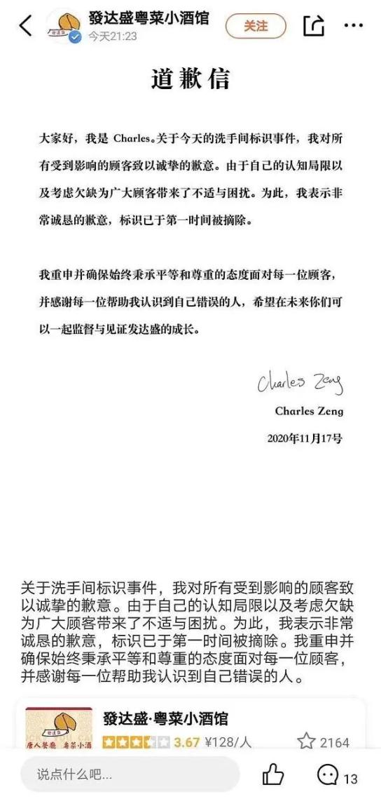 记者了解到,11月17日下午,涉事餐厅“发达盛粤菜小酒馆”公开致歉。餐馆表示,自己的认知局限以及考虑欠缺为广大顾客带来了不适与困扰,并且第一时间将标识拆卸下来。
