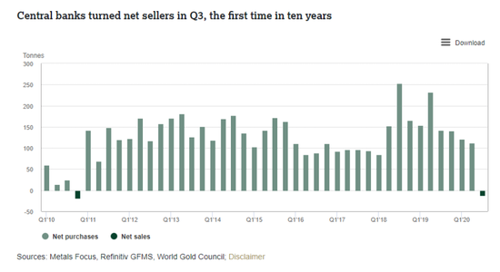 第三季度,全球央行减持黄金,这是自2010年第四季度以来的首次。