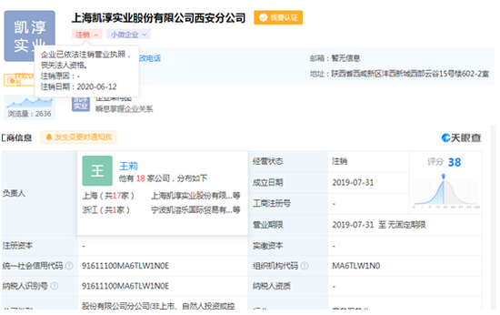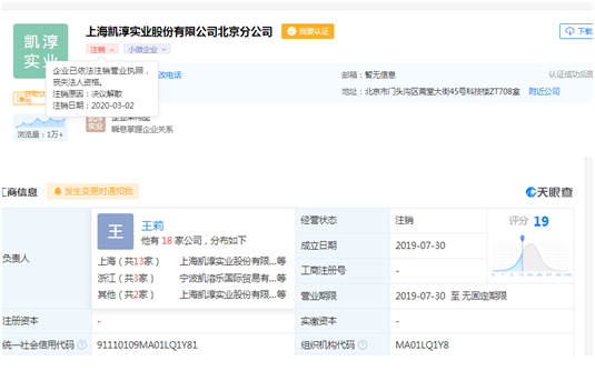 天眼查显示,2019年7月,凯淳股份先后在西安、北京设立分公司,然而凯淳股份北京分公司已于2020年3月注销,凯淳股份西安分公司于2020年6月注销。