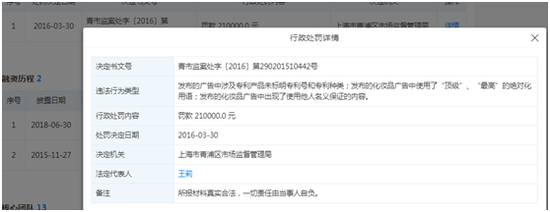 天眼查显示,2016年3月,凯淳股份因发布的广告中涉及专利产品未标明专利号和专利种类;发布的化妆品广告中使用了“顶级”、“最高”的绝对化用语;发布的化妆品广告中出现了使用他人名义保证的内容,被上海市青浦区市场监督管理局罚款21万元。