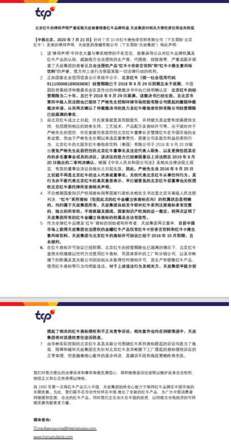 2020年11月18日 - 红牛品牌的合法拥有者天丝集团与前合作方严彬先生及其控制和附属公司的一系列诉讼,正在由最高人民法院、省高级人民法院、其他各级人民法院审慎、公正地审理。截至今日,各审理法院从未就“红牛”系列商标的所有权和使用权作出对严彬先生及其实际控制的公司(简称“严彬方”)有利的任何实体认定、裁定或判决。