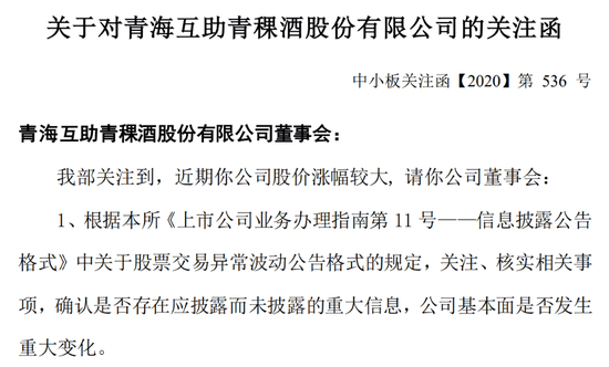深交所在关注函中表示已关注到青青稞酒股价涨幅较大,要求公司董事会根据深交所《上市公司业务办理指南第11号——信息披露公告格式》中关于股票交易异常波动公告格式的规定,关注、核实相关事项,确认是否存在应披露而未披露的重大信息,公司基本面是否发生重大变化。