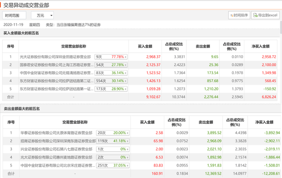 11月19日的龙虎榜显示,当天买入金额最大的前5名合计买入金额9102.67万元,占总成交比例为10.38%。其中,光大证券深圳金田路证券营业部和国泰君安上海江苏路证券营业部的买入金额均超过2000万元,净买入金额合计5058.72万元。