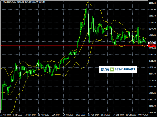 在过去的2周内黄金ETF基金持续减持黄金,而黄金走势也呈现了单边下跌形态,其背后原因有,众多制药企业宣布疫苗研制成功打压黄金避险概念,而在疫情恶化的背景下市场对于黄金的消费需求也是不振,最后各国央行货币政策实施空间狭窄,难以实现大规模流动性再度释放。所以鉴于基本面消息的利空黄金走势或将持续低迷,但投资人关注1850美元附近的技术支撑,该位置是黄金中长线的牛熊分界位置,所以存在多头支撑可能。