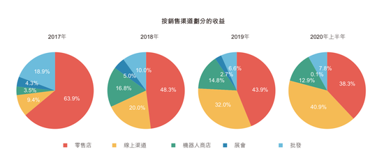 其中,线上平台是增速最快的一个渠道,2017年至2019年的收入占比分别为9.4%、20.0%和32.0%,2020年上半年的占比进一步提升至40.9%。