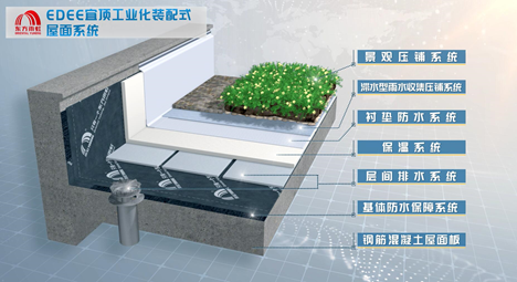 宜顶工业化装配式屋面系统,简写为“EDEE”,是由economical(经济的)、durable(耐久的)、efficient(高效的)、energy-saving(节能环保的) 首字母组合而成,寓意宜居、宜人的屋顶,该系统打破了传统防水思维,系统化解决防水问题,创新性地阐述了屋面体系各构造屋作用,解决了传统型屋面构造缺陷导致的广泛渗漏现象,是建筑屋面防水、防护领域革命性的突破。