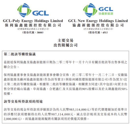 公告称,该等交易所得的现金约9.85亿元人民币将用于进一步偿还债务,按协鑫新能源集团截至2020年6月30日的未经审计财务报表计算,协鑫新能源集团的资产负债率将降低约0.7%,有效降低财务风险。