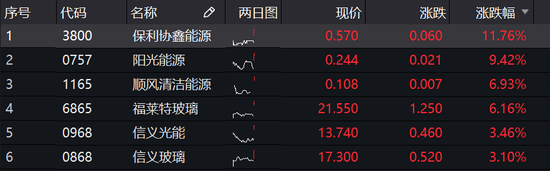 11月23日消息,光伏概念股再度走高,其中,保利协鑫能源涨12%,阳光能源涨9.4%,顺丰清洁能源涨7%,福莱特玻璃涨超6%,信义光能和信义玻璃涨超3%。