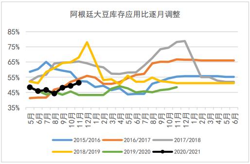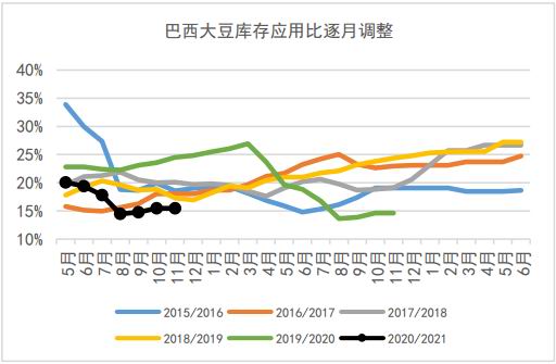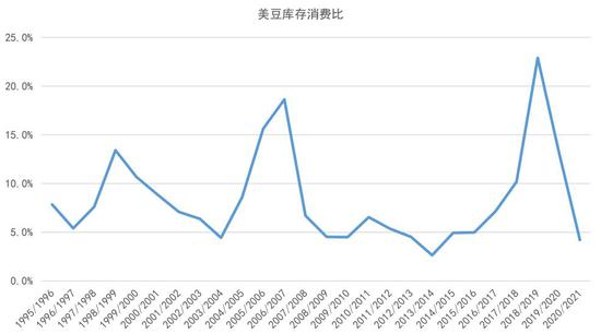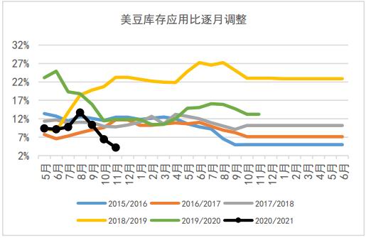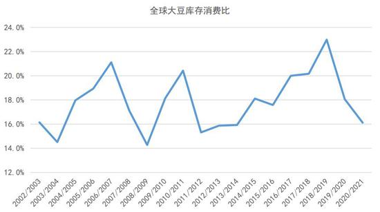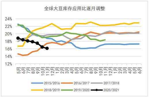 调整过后的美豆20/21年度库存消费比4.2%,上个月6.4%,历史偏低水平。全球大豆20/21年度库存消费比16.1%,上个月16.5%,历史偏低水平。