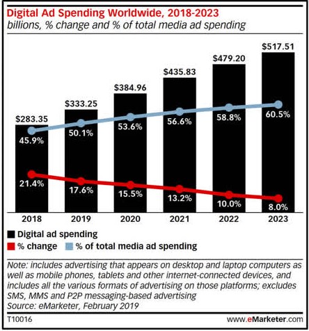 根据eMarketer数据显示,到2023年,全球数字广告市场预计将以每年10.4%的速度增长,达到5180亿美元。
