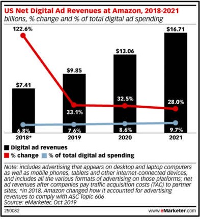 特别的是,该机构预计2020年美国数字广告支出将达到1290亿美元。换言之,仅美国一国就占据了全球约33%的数字支出。因此可以看到,这是亚马逊的主要市场机会。