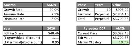 增长率:20.0%——截至2020年第三季度,亚马逊的每股自由现金流为48.46美元。自2014年以来,亚马逊的每股自由现金流以每年54%的速度增长。自2016年以来,这一增长率已下降至27%。因此,为了保守起见,假设在未来10年里,每股自由现金流的年增长率为20%。