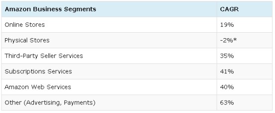 下表主要显示的是自2016年以来亚马逊各业务部门的年增长率。