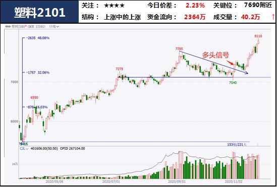 目前市场对PP和塑料维持强势感到乐观,当前两油库存处于低位,下游需求从短期看相对火爆,但需求方面也已经出现了边际递减趋势,特别是随着市场价格的大幅增长,下游工厂对高价货源持抵触心理。盘面看,塑料和PP延续强势,今日新高收盘,上涨趋势明显。多单可持有,若再次拉升新仓可轻仓试多跟随。