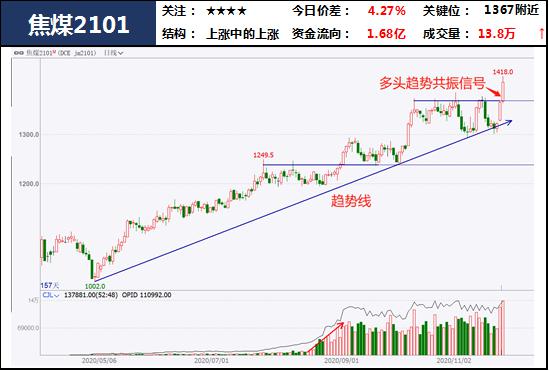 2.盘面:焦煤整体高位区间调整后,今日大幅拉升,成功上破区间上轨。