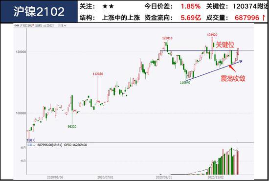 美国疫情蔓延以及英国达成脱欧协议的预期,使得美元指数呈现弱势,并且新冠疫苗利好消息提振市场乐观情绪;菲律宾进入雨季镍矿供应将逐渐下降,缺矿问题导致国内冶炼厂产量下降;加之下游不锈钢厂刚需采购,以及新能源行业带动镍豆需求,国内电解镍库存库存下降趋势,对镍价支撑增强。技术上,依托趋势线再次拉升,目前仍是向上驱动,今日冲击关键位,120000关口上方多头思路,多单可持有。