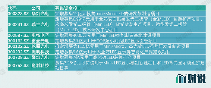 据界面新闻统计,今年已有超8家企业发布了定增预案拟投资MiniLED行业。其中包括华灿光电(300323.SZ)、瑞丰光电(300241.SZ)、奥拓电子(002587.SZ)、雷曼光电(300162.SZ)、乾照光电(300102.SZ)、洲明科技(300232.SZ)、聚灿光电(300708.SZ)、隆利科技(300752.SZ)等。