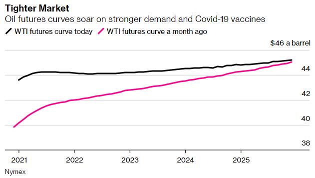 值得一提的是,随着亚洲买家需求涌现、新冠疫苗前景乐观,作为交易员看涨程度的重要指标,石油期货曲线已达到新冠疫情初期以来的最强水平。