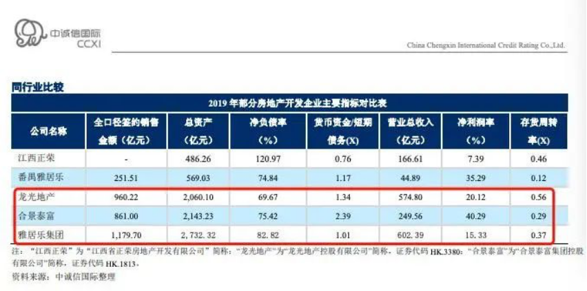 同业对比来看,雅居乐的生存情况也并不乐观。信用评级公司中诚信国际曾在报告中将雅居乐、龙光地产、合景泰富等几家地产公司主要财务指标做了表格对比。