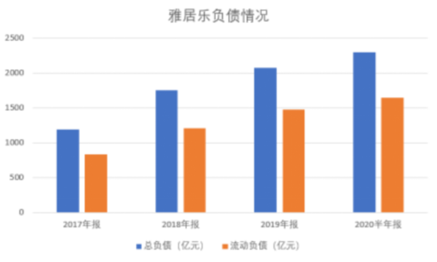 根据雅居乐半年报数据,公司的资产负债表显示,雅居乐的总负债近年来连年攀升, 2017年至2020年中的负债总额分别为1191.81亿元、1754.65亿元、2078.95亿元以及2301.66亿元。不仅负债总额高,其中大半都是流动负债,同期的流动负债分别为834.73亿元、1203.78亿元、1476.88亿元以及1643.74亿元。