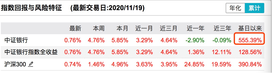 从历史回报来看,中证银行指数自基日以来累计回报达到了555.39%,平均年化回报高达12.95%。(数据来源:wind,2020-11-19)