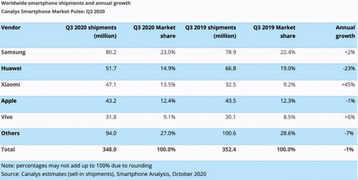 今年三季度至今,小米智能手机在全球市场便占据着愈来愈重要的地位。根据Canalys的统计,2020年第三季度,全球出货量超越苹果位居第三名。在中国大陆的市占率由去年同期的9.0%上升至12.6%,排名第四。