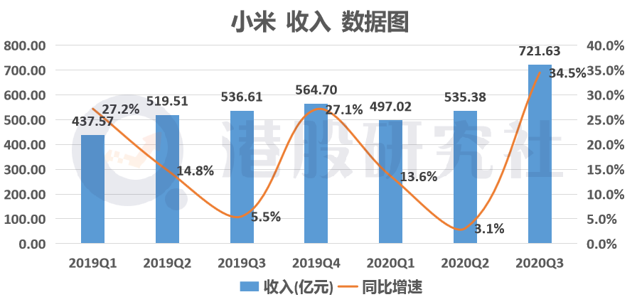 根据小米披露的最新财报显示,营收为721.63亿元,同比增长34.5%,较上季度的535.38亿元增长34.8%。结合连续多季度的表现,可以发现整体收入和同比增速均创下了历史新高。