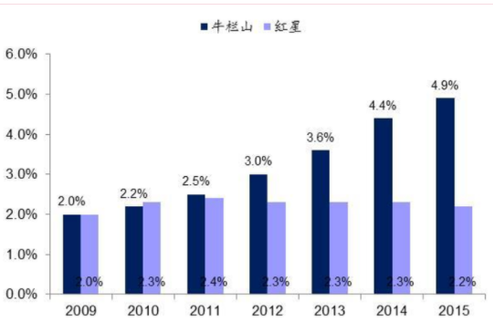 不过,根据国盛证券研报显示,2018年,牛栏山、老村长、龙江家园、红星在光瓶酒市场占有率分别为10%、6%、2%、2%,牛栏山的市场占有率高出红星8个百分点。