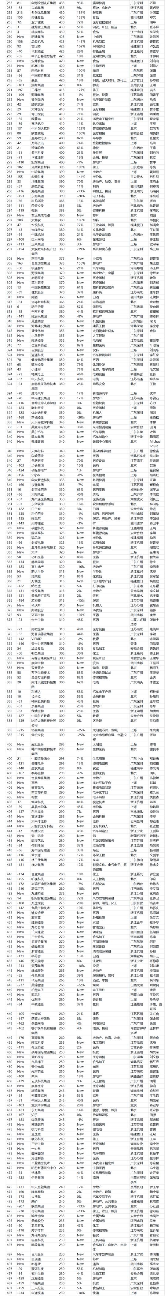 保险机构方面,中国平安保险超过蚂蚁集团排位第4,价值14800亿人民币;泰康保险排名第27位,价值3150亿人民币;阳光保险集团173位,价值615亿人民币;众安在线217位,价值500亿人民币;富德生命人寿保险324位,价值350亿人民币;前海人寿保险449位,价值260亿人民币。