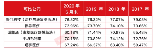 数据显示,2017年至2020年6月末,行业平均毛利率分别为72.76%、74.12%、73.82%和70.15%,然而翔宇医疗的毛利率却分别仅为59.47%、63.40%、66.37%和67.24%。显然,翔宇医疗近年来毛利率变动趋势与同行业的毛利率变化趋势并不相同,就拿2019年来说,不管是普门科技,还是伟思医疗,其毛利率数据均是出现了不小幅度的下滑,诚益通虽略有增加,但到2020年上半年便出现了大幅回落。而翔宇医疗则不然,完全不顾及行业景气度变化,毛利率一路上扬,由2017年的59.47%上升至2020年1~6月的67.24%,上涨了近8个百点,若结合《翔宇医疗涉嫌侵犯员工权益 异常成本数据侧证业绩或有“注水”》文章中谈到的各种费用奇怪变化情况,则其不同于行业毛利率变化的趋势就显得很不正常了。