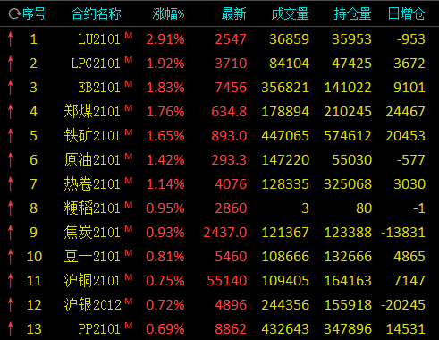 热点栏目11月26日,国内期市早盘涨跌不一,能化品多数上涨,低硫燃油涨近3%,LPG、苯乙烯涨近2%,原油涨逾1%;黑色系普涨,动力煤、铁矿石涨近2%;跌幅方面,甲醇、沪镍跌逾1%。