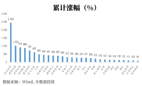在过去20年的A股市场中,医药生物的回报位居所有申万一级行业的第2位,年化回报将近13%,仅次于茅台带头的食品饮料行业,其中医疗服务等细分行业表现尤其优秀,行业牛股频出,比如恒瑞、爱尔、长春高新、通策医疗、泰格医药等。