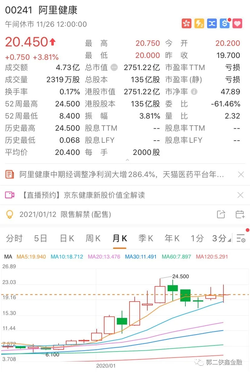 京东健康和阿里健康是一个级别的,对标阿里健康,2020财年(2019年4月1日—2020年3月31日)营收96亿元,经调整净利为2.61亿元;2020上半财年(4月1日—9月30日)实现收入71.62亿元,经调整后利润净额达到4.36亿元,同比增长286.4%。