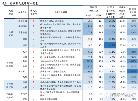 2020年前10月涨幅低的上游资源品行业11月反攻,实质反映市场对全球经济复苏的一致预期增强。11月初以来2020年前10月表现低迷的大宗商品集体反攻,有色、钢铁、煤炭、石化涨幅居于行业前列。疫苗上市时间表逐步清晰、国内经济持续复苏、CRB和南华工业品指数加速上涨,基本面和商品价格共振助推股市大宗行情。国内10月经济数据表现超预期,出口实现双位数增长,三大投资加速回升,工业增加值超预期反弹。海外辉瑞和莫德纳新冠疫苗有效率均超90%,首批疫苗大概率2021年一季度上市。大宗反攻行情背后实质是市场对全球经济复苏的一致预期增强。此外,机构集中持仓和市场估值结构极致化的矛盾,也触发了年末调仓保收益的诉求,低估值、盈利改善确定性较强的周期板块开始跑赢市场。