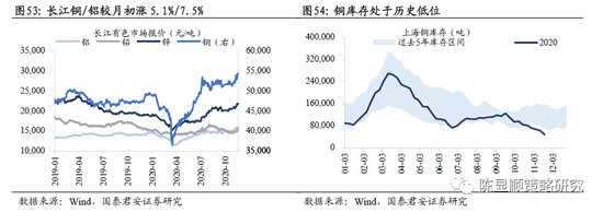 结构性复苏下资源品行情大概率走强分化,全球消费+供需错配+低库存品种上涨持续性更强。展望2021年经济复苏大概率呈现结构性特征,疫后全球经济复苏引致海外补库需求,稳杠杆、防风险的诉求使得来年财政刺激和地产融资力度预计均弱于2020年,出口、制造业投资强于基建地产投资。结构性复苏下大宗商品涨价动能不一,映射股市资源品上涨行情大概率会走向分化而非共振。全球消费、供给边际减少、需求边际改善、库存处于历史低位的品种上涨行情的持续性将更强,相关品种建议关注铜、锂、玻璃、玻纤、大炼化、面板。
