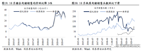 生猪养殖:11月猪肉均价环比下跌,白羽肉鸡价大涨。22省生猪均价延续上月下跌趋势,11月环比跌4.9%,跌幅较上月收窄进10个百分点。10月主要猪企销售肉猪头数涨跌不一,温氏出栏低位走升1.4个百分点,牧原、新希望出栏头数均下滑8.5个百分点左右。主要猪企肉猪出栏销售均价下滑,降幅与市场持平,为14%左右。