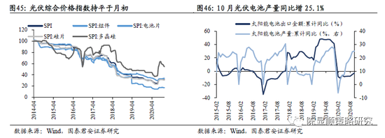光伏:光伏玻璃紧缺制约组件生产,成本支撑组件价格高位震荡。10月中旬硅料短缺局面缓解,但光伏玻璃供给紧张,成本支撑使得组件价格高位震荡。10月光伏电池产品维持同比25%的高速增长,但增长斜率放缓,光伏玻璃供给紧张和持续涨价已经对下游组件厂商形成制约,工信部着手主导适度放宽玻璃产能置换条件,主导平板玻璃产线转型光伏玻璃,但疫情后浮法玻璃产量及库存也处于近4年低点,转换生产线可能放大建筑玻璃供给缺口,玻璃行业供需偏紧格局预期延续。