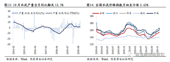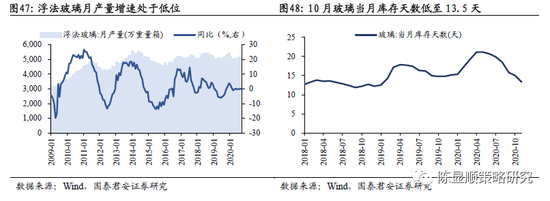 低基数效应下基建反弹低于预期,地产投资驱动施工活动走强。年中暴雨洪涝灾害后,10月基建投资转升,但考虑专项债高增和低基数效应影响后,基建实质表现低于预期。地产快开工抢销售成为地产投资冲高的主动能,建材产销数据亦从侧面验证施工活动活跃度提升,10月水泥产量创双位数增长,带动全国水泥指数上行。浮法玻璃库存加快去化,目前库存已降至近五年低位水平,催化了玻璃期货涨价。挖掘机工作小时数亦创近5月高点。四季度施工进入传统旺季,建材及相关化工品需求有望持续改善。