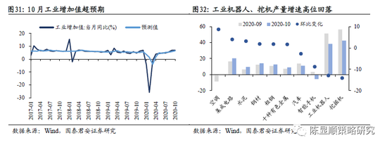工业总体:工业增加值超预期回升,出口产业链复苏更快。得益于出口持续高增和制造业资本开支扩张动能增强,工业增加值连续三个月超预期回升,10月工业增加值当月同比报6.9%,较预期值高0.41个百分点。工业生产主要产品中,挖掘机、服务机器人当月产量同比高位环比回落。出口产业链的制造业,如空调、集成电路环比改善幅度最大。