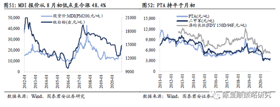化工:MDI从年内低点反弹近50%,PTA、涤纶长丝持平于月初。家电出口需求回暖,海外MDI产能遭遇不可抗力停产,MDI现货从8月年内低点反弹48.5%。,国内地产竣工复苏、海外需求回暖、成本端钛矿维持高位,钛白粉从10月初低点上涨16%。聚酯产业链产品价格暂稳,PTA、涤纶长丝报价持平于月初。