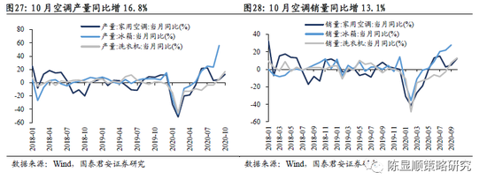 家电:内销市场冷热不一,出口订单维持强劲。9月冰箱行业淡季不淡,产销同比继续保持高速增长,增长幅度均超过25%。工厂普遍满产,但订单过多,存在交付期延长迹象。空调内销进入淡季,外销需求强劲增长,10月空调销量同比12.7%,其中内销增速同比4.5%。洗衣机同样出现内销出货节奏缓和,出口端大幅增长情况,10月洗衣机销量同比13.1%,其中内销增速同比9%。