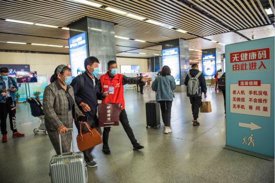 图③:江苏无锡火车站设立无健康码服务通道。使用老人机、无微信、无手机等无法出示健康码的旅客可以通过该通道领取纸质版通行证出站。