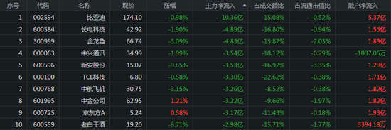 比亚迪、长电科技、金龙鱼分别遭主力资金卖出10.36亿元、4.89亿元、4.83亿元。