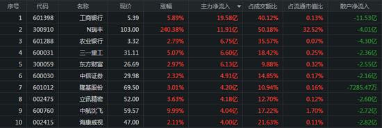 从个股来看,主力资金最青睐的3只股票分别是工商银行、N瑞丰、农业银行,流入金额分别为19.58亿元、11.91亿元、6.75亿元,所对应的涨幅分别为5.89%、240.38%、2.79%。